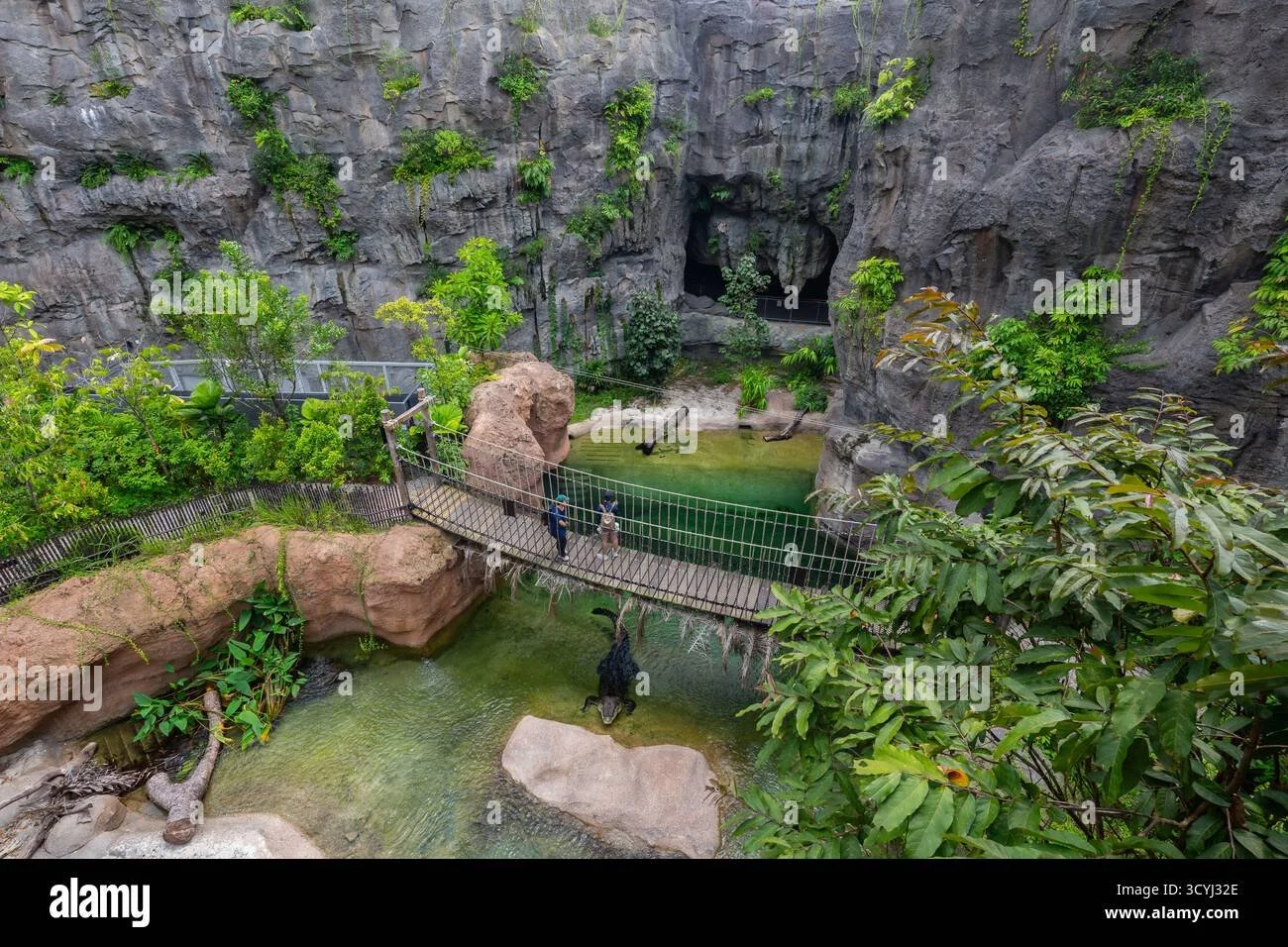 Aerial view of crocodile bridge section. Visitors standing on bridge, adventure at Rainforest Wild Asia, Mandai Wildlife Reserve, Singapore