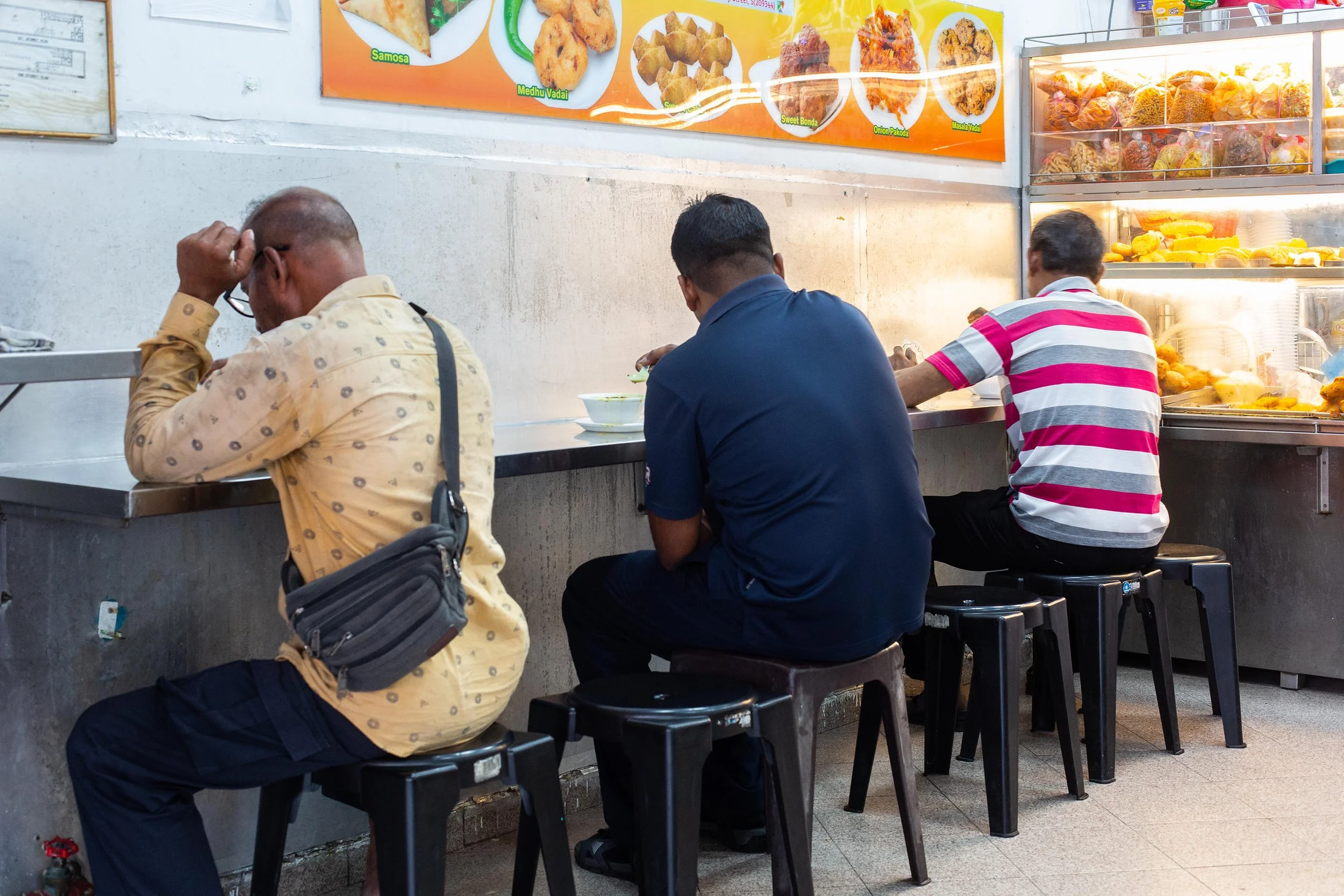 I passed an Indian snack shop with three men sitting in a row. At first, I walked on, but then turned back. Interestingly, they had left a chair between each of them, creating a visual rhythm of space and separation as they enjoyed their food.