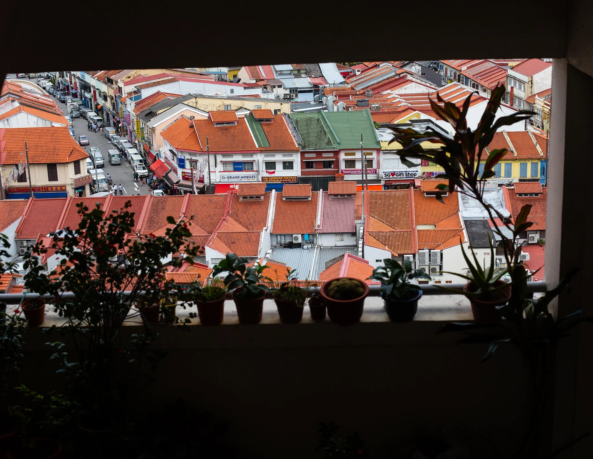 I went up to a nearby HDB block to seek a different perspective. Instead of the usual Instagram-style shots, I framed the shophouses through the corridor’s open space, using potted plants in the foreground as an extra layer of element, reflecting lifestyle of local residential.