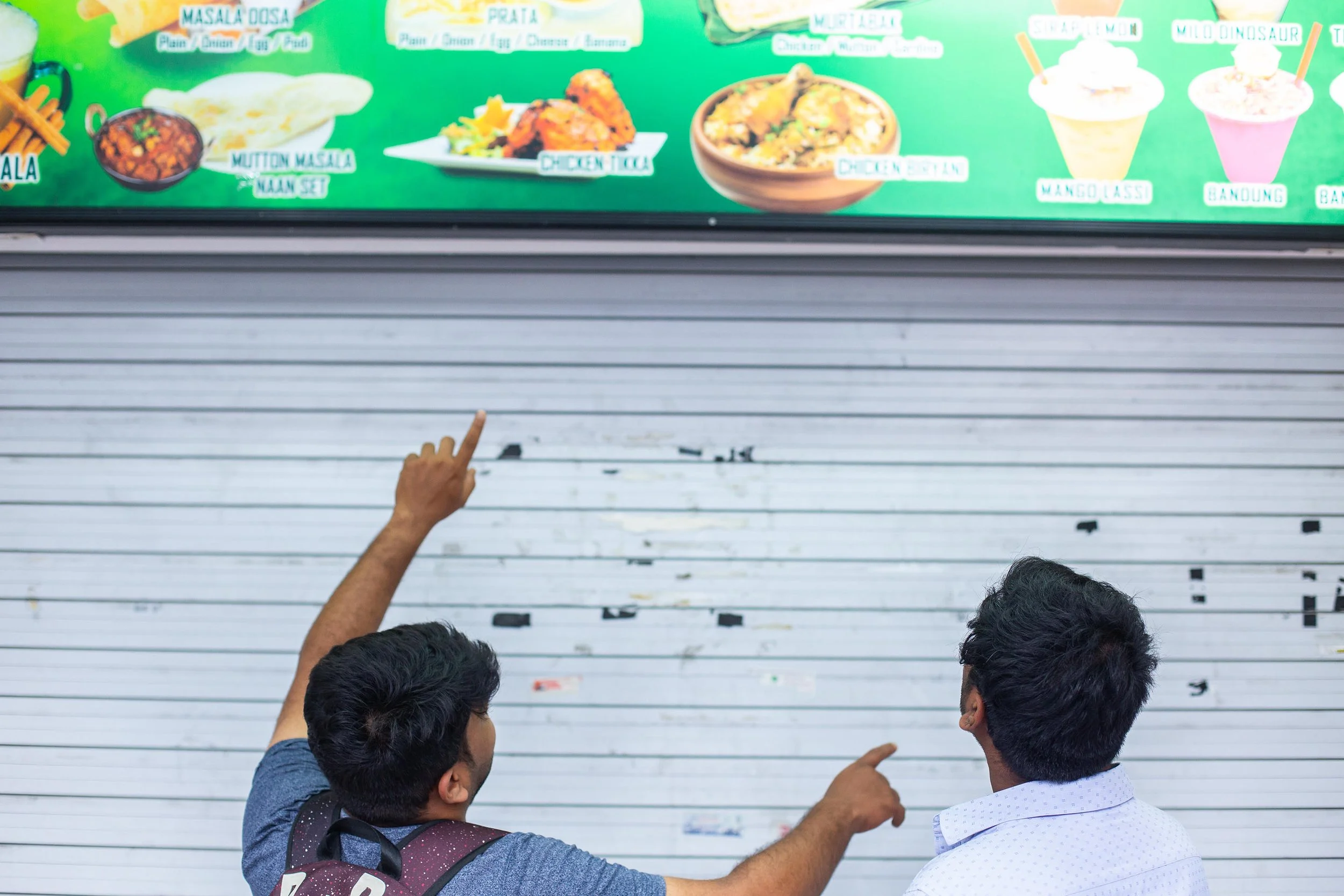 Two Indian men stood in front of a shuttered restaurant. One was pointing at the food menu, explaining something to his friend. I struggled to frame the shot in the narrow street, stepping backwards quickly and safely, afraid I might lose the moment. It turned out to be my favorite picture of the day. Even after I left they were still in conversation.