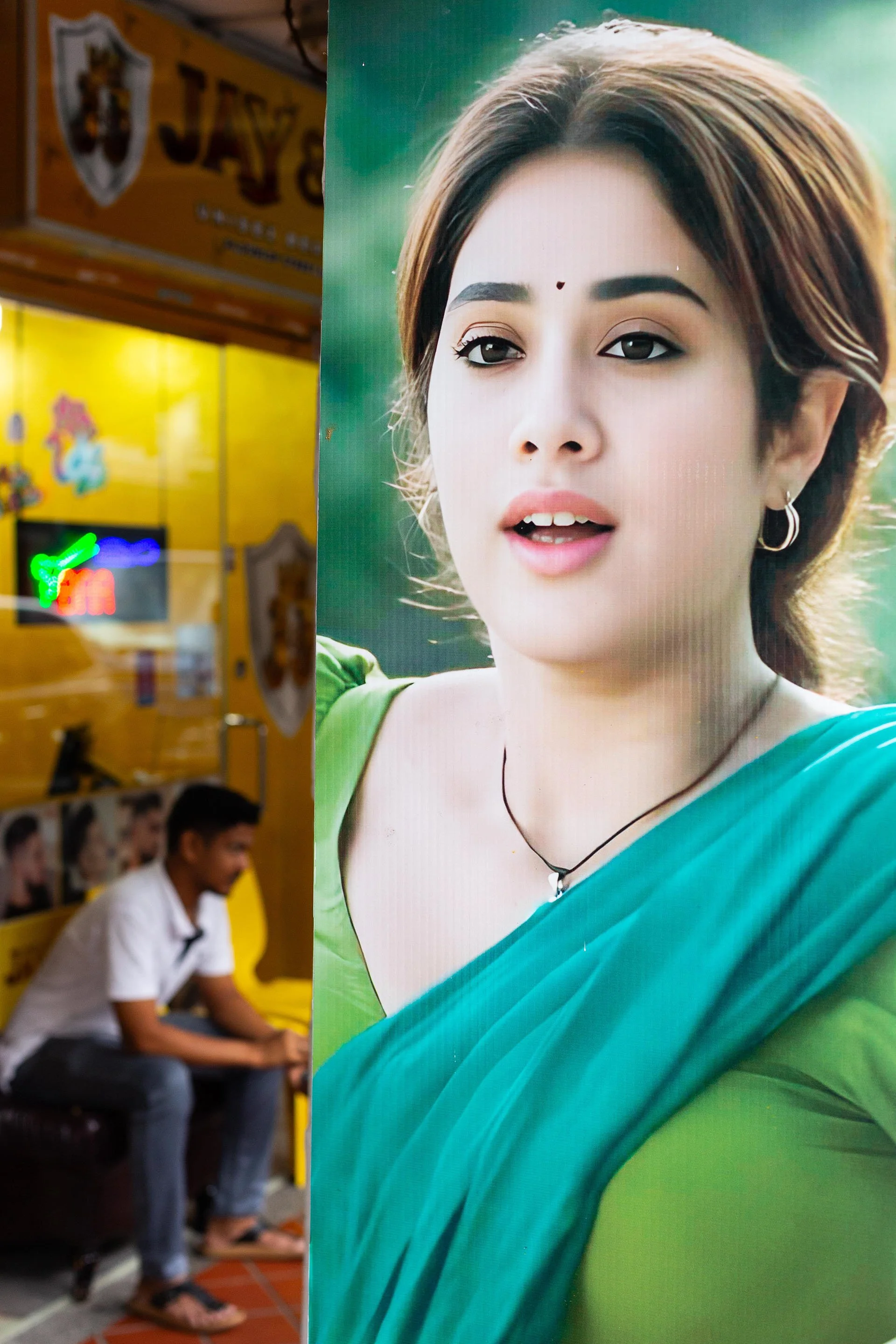 A large poster of a fair-skinned Indian woman in a green sari caught my attention. In the background, an Indian man was relaxing under green and red neon lights. I loved the contrast. I waited, hoping someone in a green outfit would walk past to complete the scene—but sometimes street photography leaves the story open.