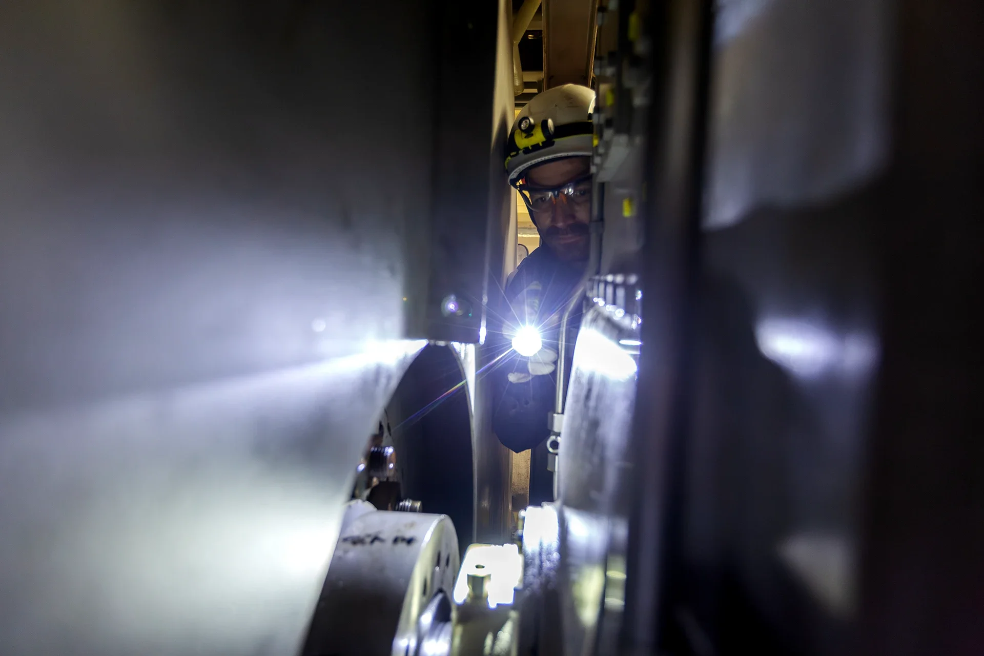 Engineer inspecting mechanical components under low light condition in a maritime setting.