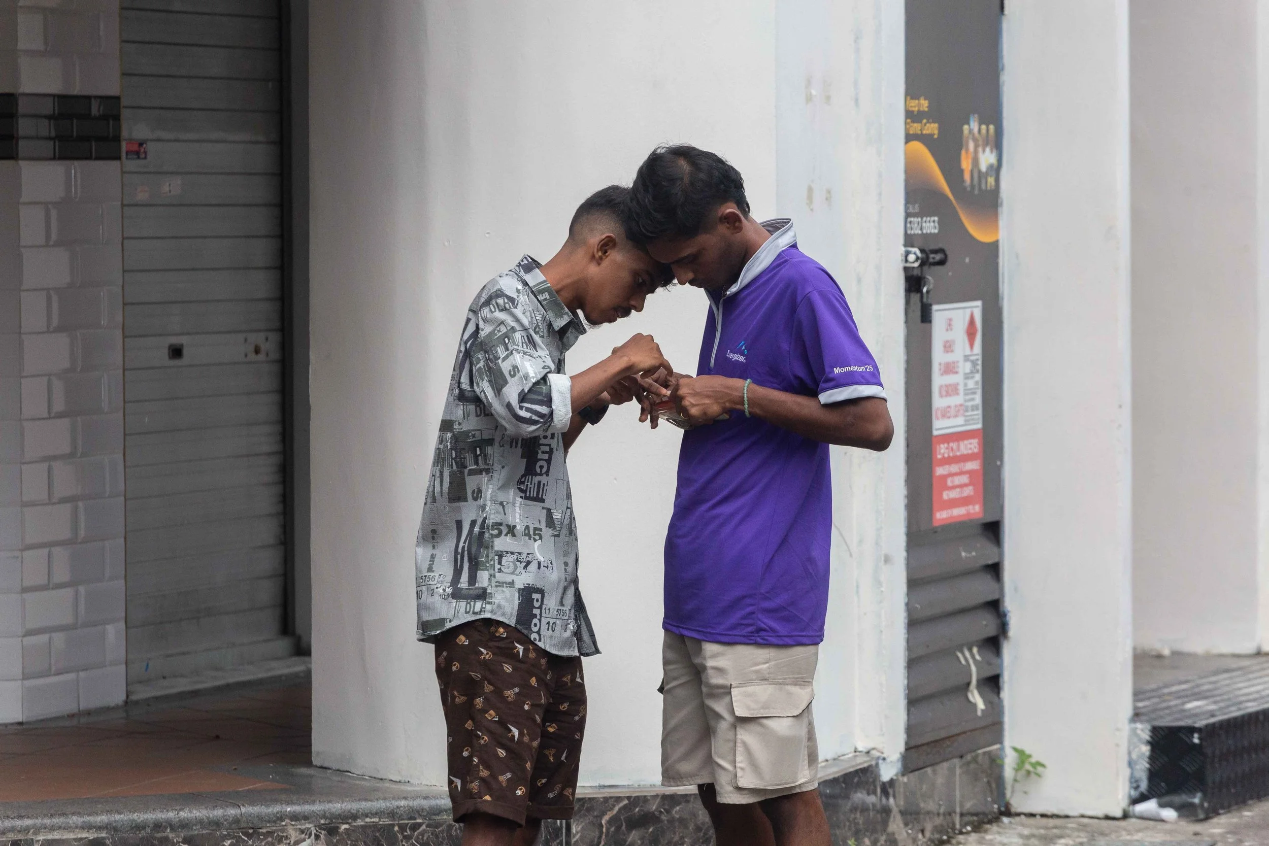 I noticed the two men standing closely together at the busy roadside for a good full minute. From where I was, it took me a while to figure out what they were doing, so I quickly snapped a few shots — and then a few more. Soon, I realized the man on the left was helping his friend peel off the plastic on his mobile phone. It felt like a brotherly moment, simple yet meaningful. Helping each other when both are far from home. I need to say that our foreign workers are the unsung heroes of Singapore!